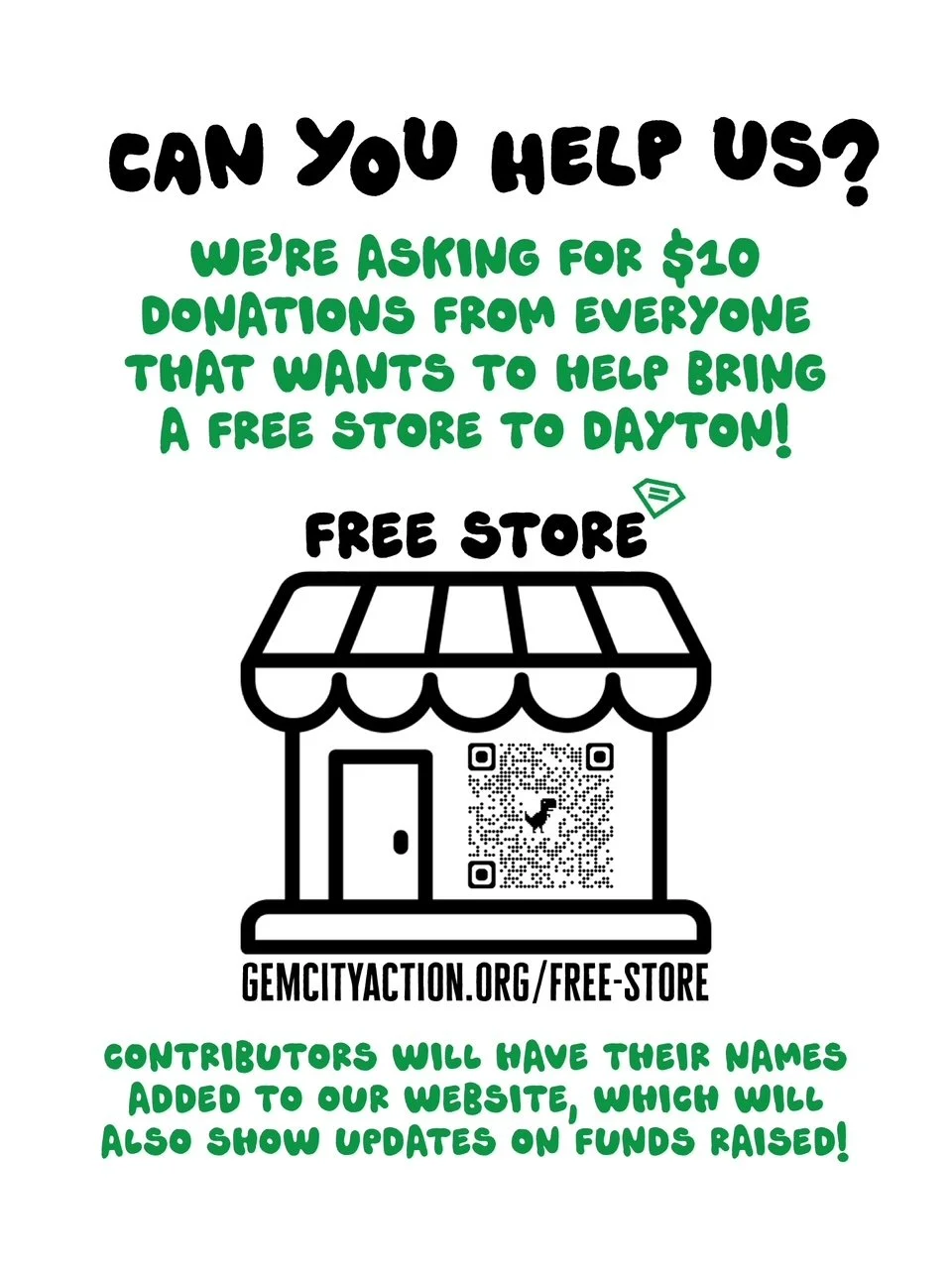 We are currently looking for a space near downtown Dayton to set up a FREE STORE for our community!